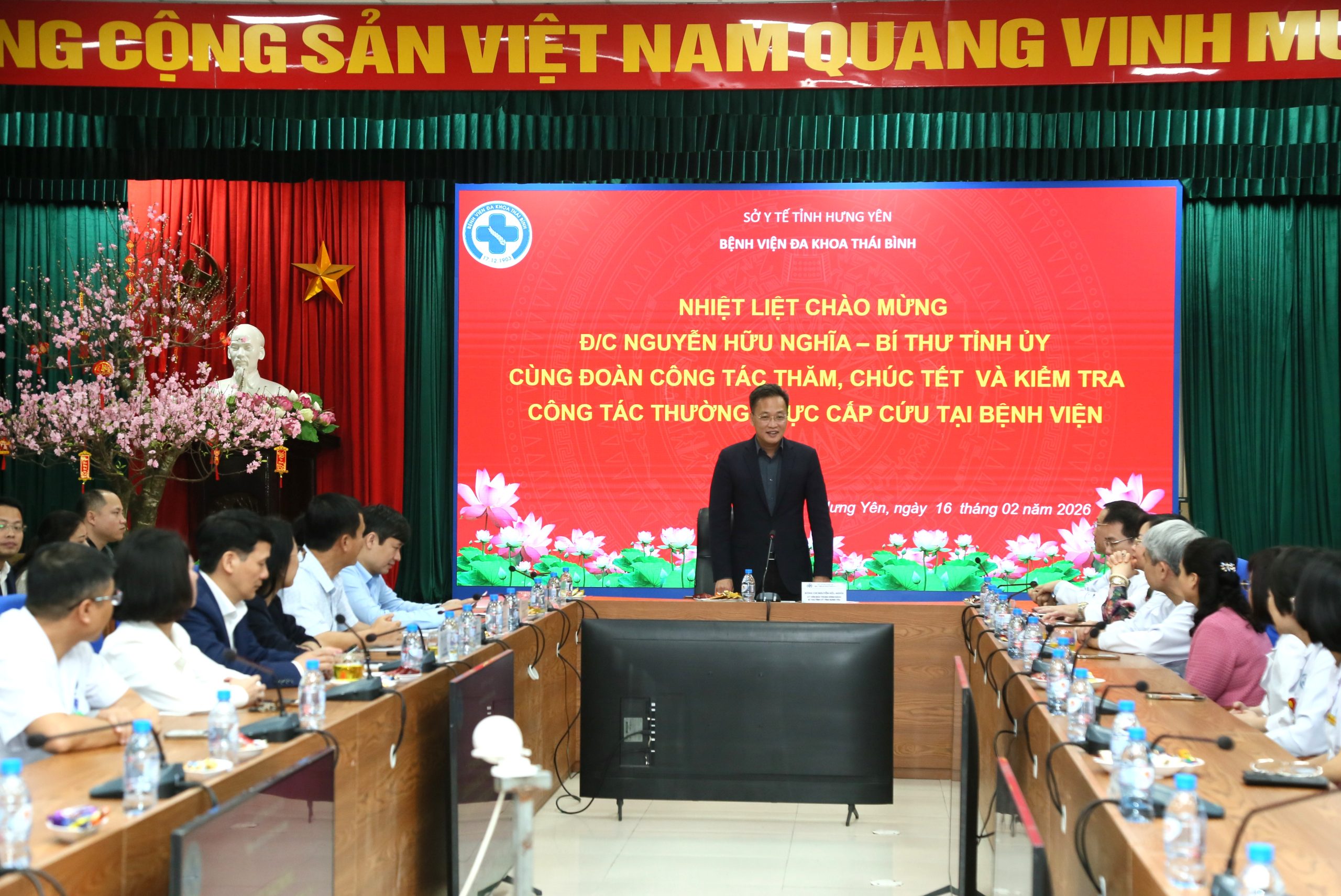 Nhân dịp Tết Nguyên đán Bính Ngọ 2026, sáng ngày 16/2 ( tức 29 Tết) Đồng chí Nguyễn Hữu Nghĩa, Ủy viên BCH Trung ương Đảng, Bí thư Tỉnh ủy cùng đoàn công tác của Tỉnh ủy, HĐND, UBND tỉnh đến thăm, chúc tết và kiểm tra công tác thường trực cấp cứu tại Bệnh viện Đa khoa Thái Bình. Tiếp đoàn có TTƯT. BSCKII Hà Trung Kiên, Giám đốc Bệnh viện, các đồng chí trong Ban lãnh đạo Bệnh viện, lãnh đạo các khoa/phòng/trung tâm và đại diện các kíp trực.