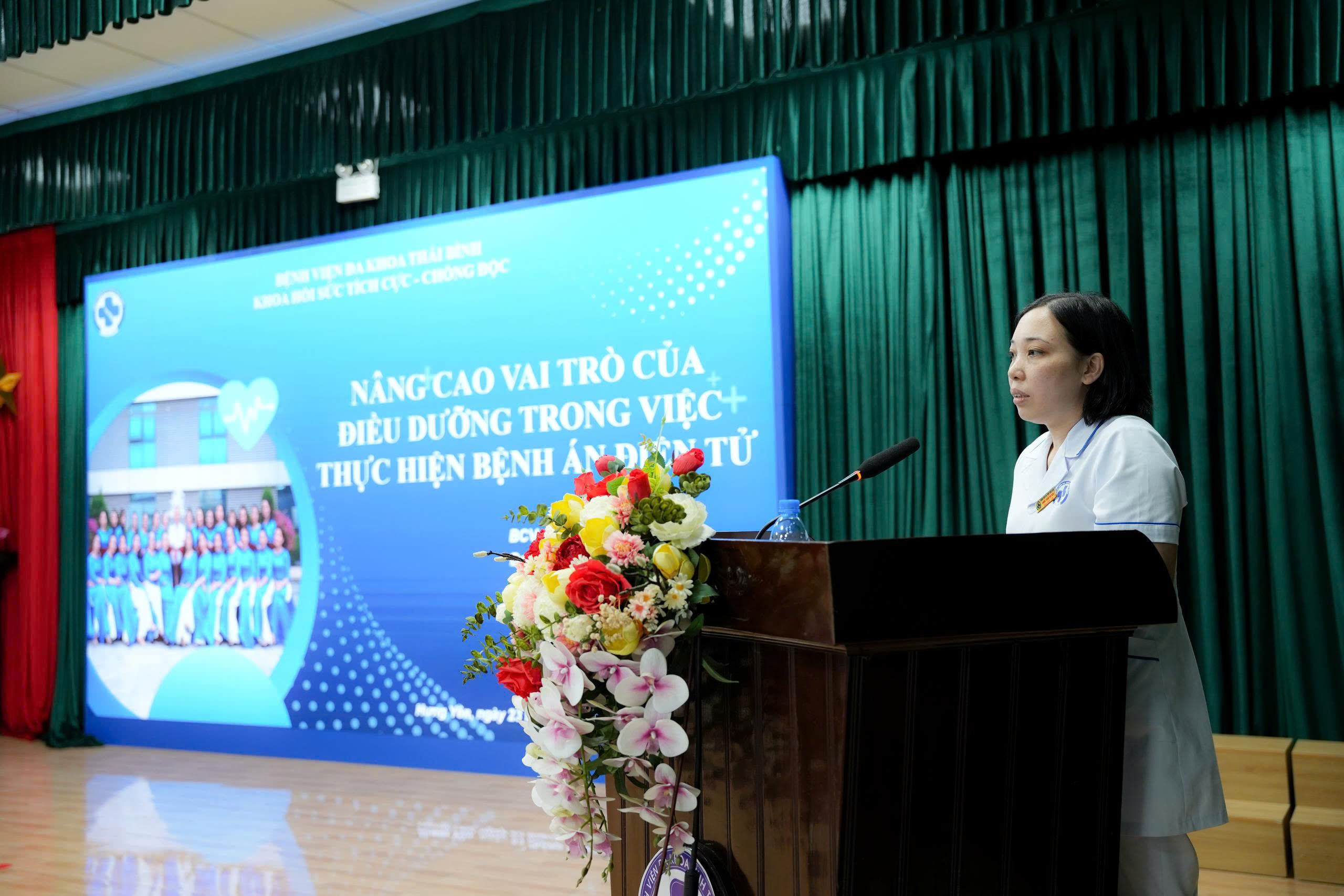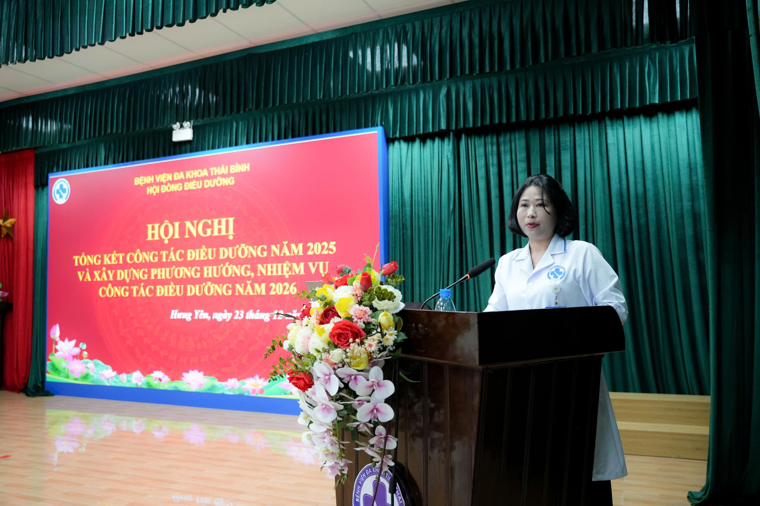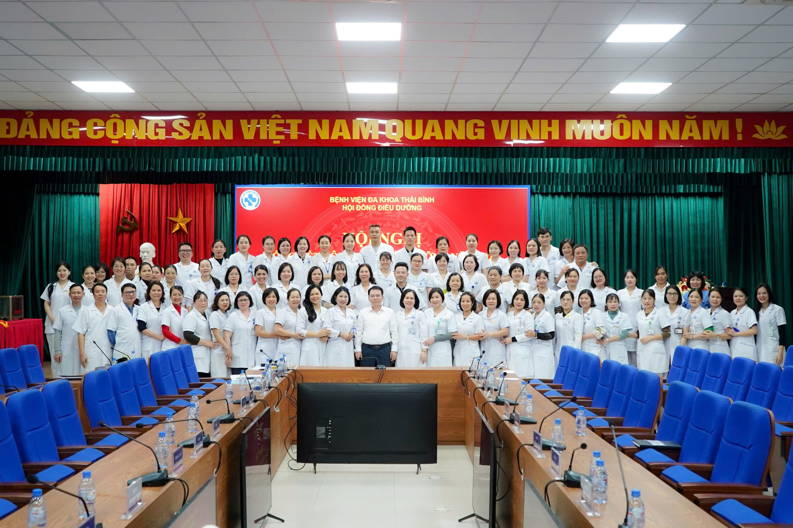 Chiều ngày 23/12/2025, Bệnh viện Đa khoa Thái Bình tổ chức Hội nghị giao ban Điều dưỡng Trưởng mở rộng về việc “tổng kết công tác Điều dưỡng năm 2025 và xây dựng phương hướng, nhiệm vụ năm 2026”. Dự hội nghị có: TTND.TS. BSCKII Lại Đức Trí, Phó Giám đốc Bệnh viện, Chủ tịch Hội đồng Điều dưỡng, điều dưỡng trưởng/ kỹ thuật y trưởng các khoa/phòng/trung tâm và hơn 100 điều dưỡng, kỹ thuật y đại diện cho 700 điều dưỡng, kỹ thuật y, dược sĩ Hạng IV, hộ lý, y công toàn viện.